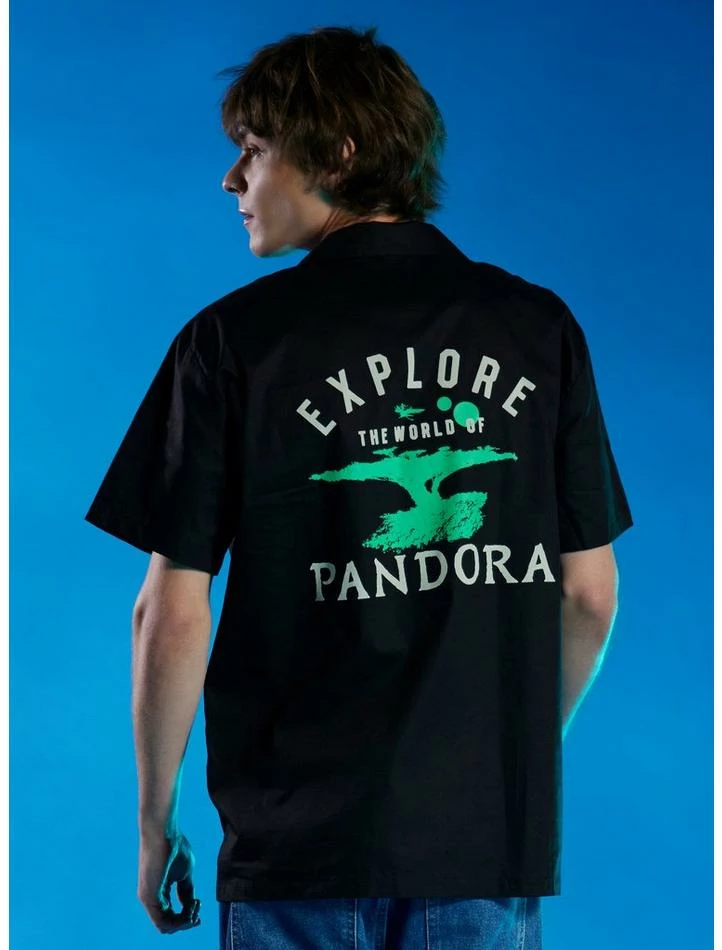 Soar through the skies of Pandora with this Avatar: The Way of Water woven button-up! Become in tune with the world’s rich landscape and learn the ways of the Na’vi. This shirt features the film’s “A” logo printed at the chest with Woodsprites, plus and image of Hometree on the back framed by “Explore the world of Pandora.”